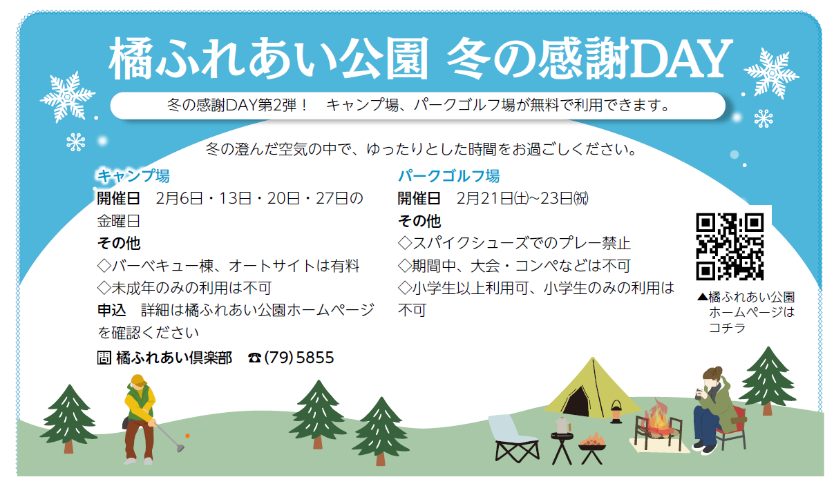 寒さの中にも、心あたたまるひとときを。 日頃の感謝を込めて、橘ふれあい公園では冬限定の特別イベント「冬の感謝DAY」を開催します! 自然の中でのんびり過ごしたり、家族や仲間と楽しい時間を過ごしたり…冬の思い出づくりに、ぜひご参加ください!