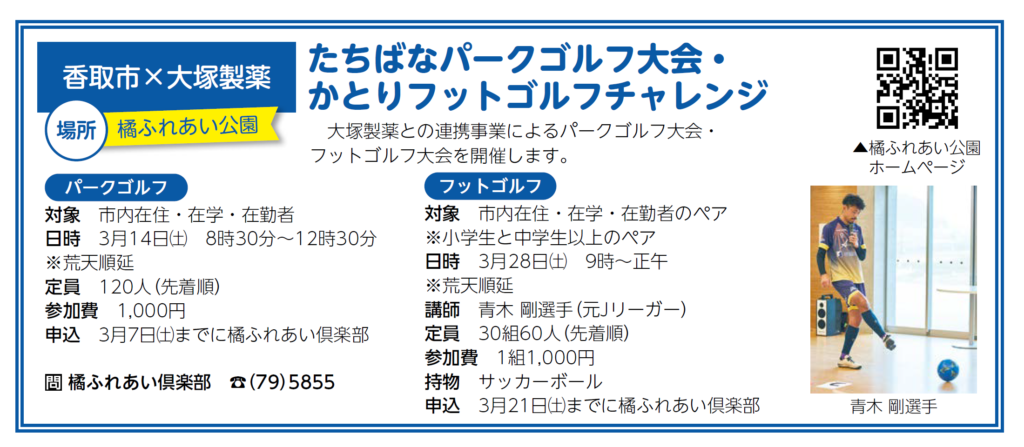 ⚽️🏌️♂️かとりフットゴルフチャレンジ参加者募集!🏌️♀️⚽️ 3月28日(土)、橘ふれあい公園パークゴルフ場で、話題のスポーツ「フットゴルフ」の体験会を開催します!サッカーボールを使ってゴルフのようにプレーする新感覚スポーツです!今回も元鹿島アントラーズで現在はフットゴルフ日本代表として活躍する青木剛選手が登場してくれます!直接指導を受けながら、楽しくフットゴルフを体験できます。対象は市内在住・在勤・在学の小学生(必須)とその同伴者(中学生以上)で、2人1組の30組限定。応募期間は3月21日(土)まで。定員になり次第締め切りとさせていただきます。ボールは持参、服装は動きやすいスニーカーで!小雨決行。ぜひこの機会に、新しいスポーツにチャレンジしてみませんか?