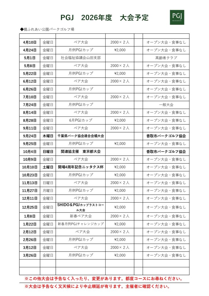 お知らせ パークゴルフ 🌿2026年度 パークゴルフ大会日程のお知らせ🌟 2026/03/31 いつもパークゴルフ場をご利用いただきありがとうございます。 2026年度も、みなさんに楽しんでいただける大会を下記のとおり開催いたします⛳✨ 初心者の方も大歓迎。ぜひお友だちやご家族を誘ってご参加ください! また4月1日より運用時間が変更になります。 開始時間 08:30 最終受付時間 16:00 終了時間 17:00 記事一覧に戻る